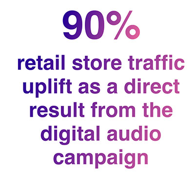 By utilizing AdsWizz interactive audio format, Big Mobile campaigns exceeded expectations and obtained outstanding and measurable results. Store tracking was tested and revealed a 90% lift in footfall traffic to the client’s retail locations when individuals listened to their