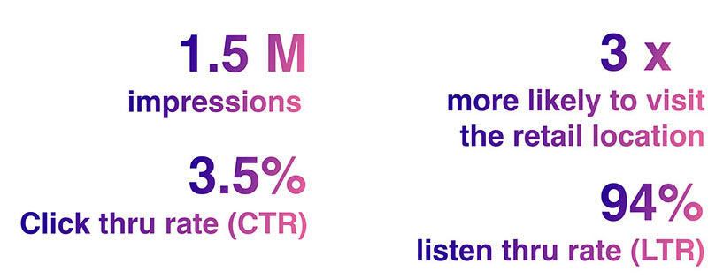 Audion also worked with Happydemics, a third party solution for measuring effectiveness of campaigns, to follow up with online surveys to measure brand recall, intent to visit, and actual visits into the stores, comparing those that heard the ads and a control group that did not.