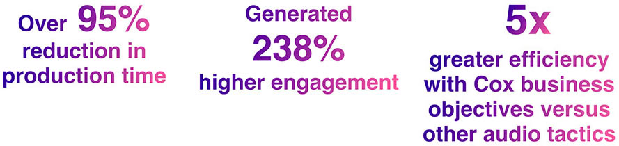 Cox was looking for a way to create more personalized experiences with audio advertising in new and different ways, and increase the effectiveness of their ads. However, they knew that creating fully personalized audio ad experiences can be time consuming and expensive.