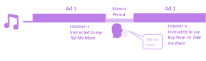 A voice ad includes a portion that prompts the listener to utter a particular reply to trigger a specific action (e.g., “Want to find out more about our offer? Say ‘Yes’ after the beep to visit our website”). If a listener says any predefined set of words/phrases during a time interval (the silence period) after the beep, one of four actions will be triggered visit a website, buy a coupon, call a phone number, or play the second part of the Voice Ad.