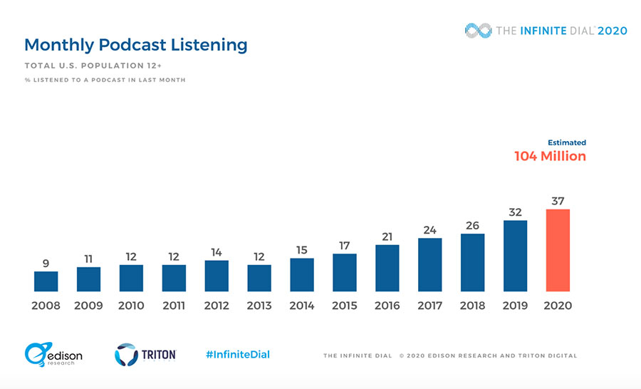 Most people don’t ask, “What’s a podcast?” anymore … instead they ask, “What podcasts are you listening to right now?” It’s a sign of the times and the growing prominence of long-form talk radio. Bursting onto the scene in a big way in 2014 with Sarah Koenig’s addictive podcast Serial, this form of media is growing exponentially. According to Edison Research, nearly half the US population – 155 million people – listen to podcasts, with over 104 million people listening at least once a month. In three short years, 1.85 billion podcast listeners are expected globally, according to research by Ovum.